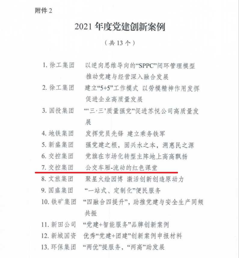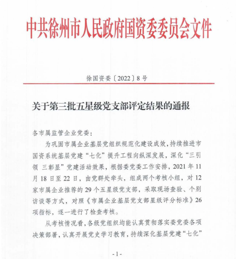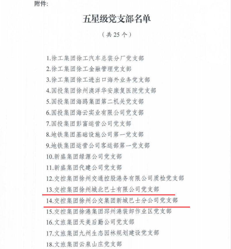 市國資委黨委還下發(fā)了《關(guān)于第三批五星級黨支部評定結(jié)果的通報》,其中徐州公交城北巴士公司黨支部、新城巴士公司黨支部被命名為“五星級黨支部”。