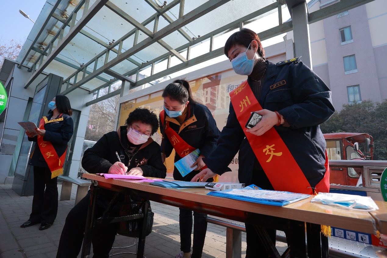 活動現(xiàn)場,懸掛起了標(biāo)有“公交送溫暖、服務(wù)走在前”的橫幅標(biāo)語,志愿者們統(tǒng)一身著行業(yè)服,身披鮮紅綬帶。大家分工明確,以飽滿的精神面貌向市民宣傳綠色出行,發(fā)放《徐州公交乘車線路指南》,引導(dǎo)市民文明乘車,解答市民問題,協(xié)助駕乘人員做好“健康碼”查驗工作,幫助老年人注冊“健康碼”,教老年人使用“徐州公交”APP查詢公交線路實時狀態(tài),攙扶特需乘客上下車等。