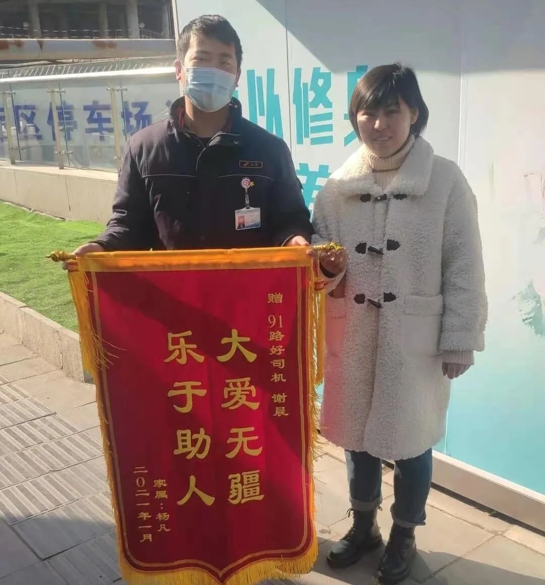 據(jù)公交車司機(jī)謝師傅介紹,這位老人從彭城路上車以后就一言不發(fā),找了個(gè)座位就坐了下來。一路上,老人一會(huì)有些迷茫的左顧右盼,一會(huì)又靠在扶手上打盹。老人這些反常的舉動(dòng),引起了謝師傅的注意。謝師傅與老人一番交流后,老人竟說不出自己的家庭住址,一時(shí)間可把謝師傅給急壞了。在終點(diǎn)站,謝師傅一邊說著安慰寬心的話,一邊通過她隨身物品尋找家人的聯(lián)系方式。正在這時(shí),老人隨身攜帶的一臺(tái)定位功能的手機(jī)響起,謝師傅替老人接通電話,告知其子女老人目前所在位置。打完電話以后,謝師傅又用手機(jī)打字的方式告訴老人,他的孩子很快就會(huì)來接她。看到這條信息以后,一直焦躁不安的老人似乎長出了口氣。隨后,“迷路”老人的女兒將老人接回了家。1月18日上午,老人的女兒帶著錦旗來到了91路車隊(duì)。原來她媽媽患有阿爾茨海默癥,當(dāng)天是她爸爸帶著媽媽到市中心逛街,一不小心讓媽媽走丟了。在聯(lián)系上謝師傅前,她媽媽已經(jīng)走失近兩個(gè)小時(shí)了。幸虧遇到了好心的公交司機(jī)謝師傅,并一直在調(diào)度室陪著老人。今天她特意來到車隊(duì)當(dāng)面表示感謝。