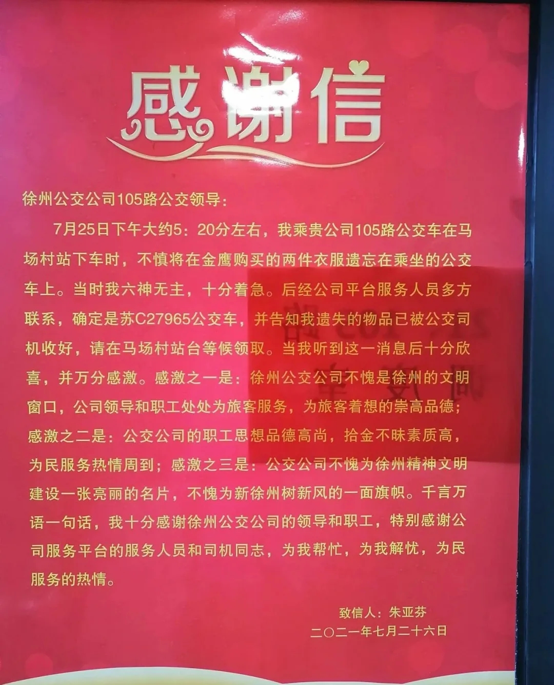 “我一時(shí)疏忽丟了東西,如果沒有袁丁師傅,我這兩套西服就不知所蹤了,真的非常感謝?!?月26日,乘客朱先生送來感謝信,對(duì)徐州公交的暖心服務(wù)表示贊許。