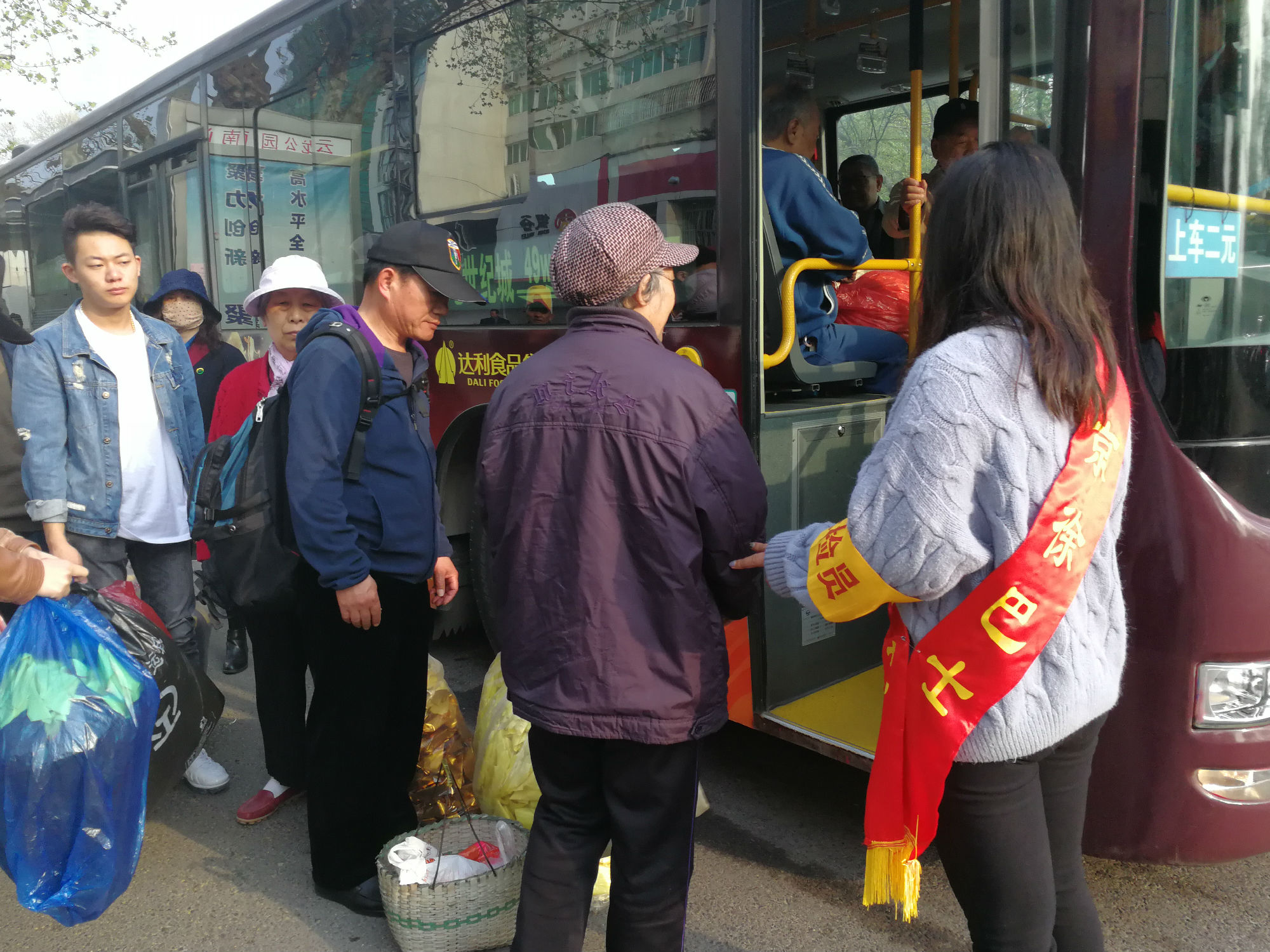 云龍公園南門,站滿了拿著大包小包的乘客?!按蠹遗藕藐?duì),注意安全,不要擁擠,需要換零錢的乘客可以到零幣兌換處換取零錢?!敝驹刚呶⑿χS持現(xiàn)場秩序。人群中有位提著兩個(gè)大包裹的大媽,志愿者走到大媽跟前,關(guān)切地詢問:“大媽,我來幫您把包裹拿上車吧?!敝驹刚咭皇?jǐn)v扶老人上車,一手拿著物品,為其安排好座位并叮囑大媽注意安全。一班車走后,還沒撈著喝口水,現(xiàn)場又聚滿了乘客,志愿者們又開始忙碌起來:“大爺,車還要一會(huì)才能來,您先坐這歇一會(huì)吧?!敝驹刚吣脕戆宓?,讓老大爺坐下休息,老大爺十感動(dòng),說道:“你們真貼心。